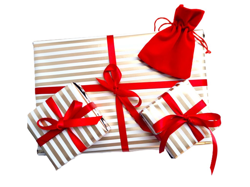 Každý dárek je zabalený v dárkovém papíru a převázaný stuhou.