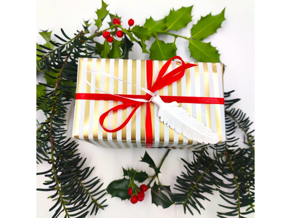 Balíček Vám přijde zabalený ve vánočním papíru se zlatými pruhy a převázaný atlasovou červenou stuhou.