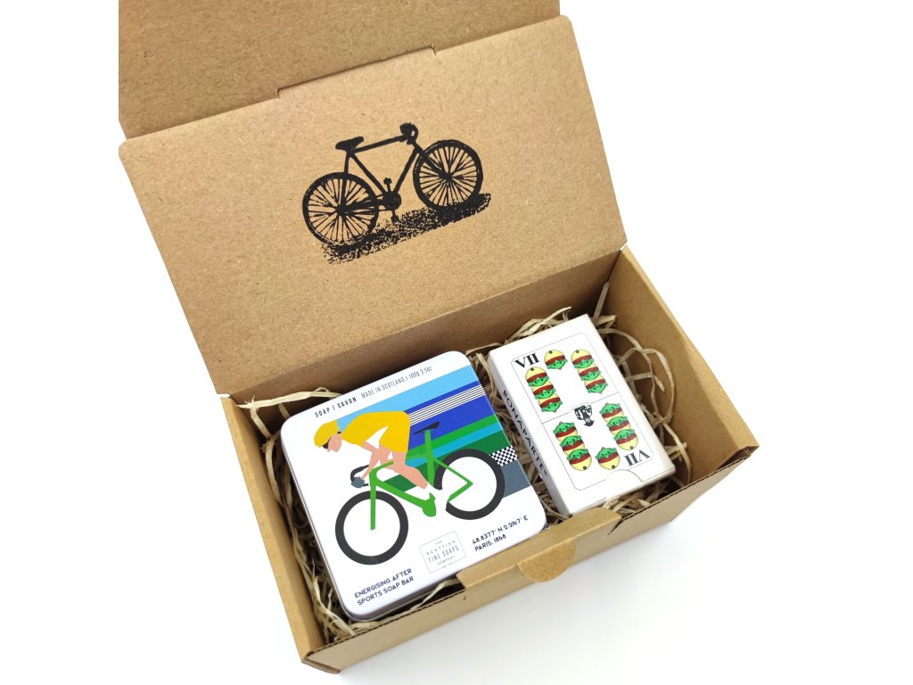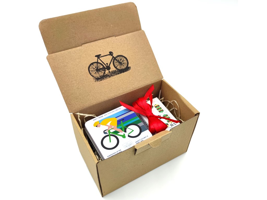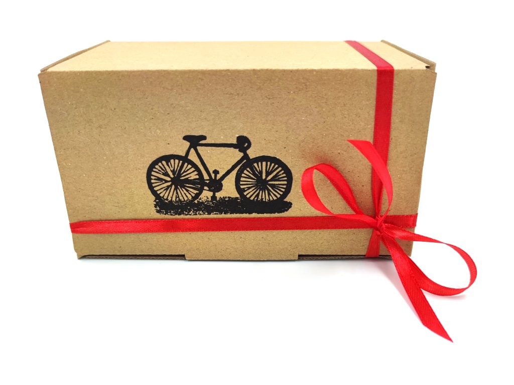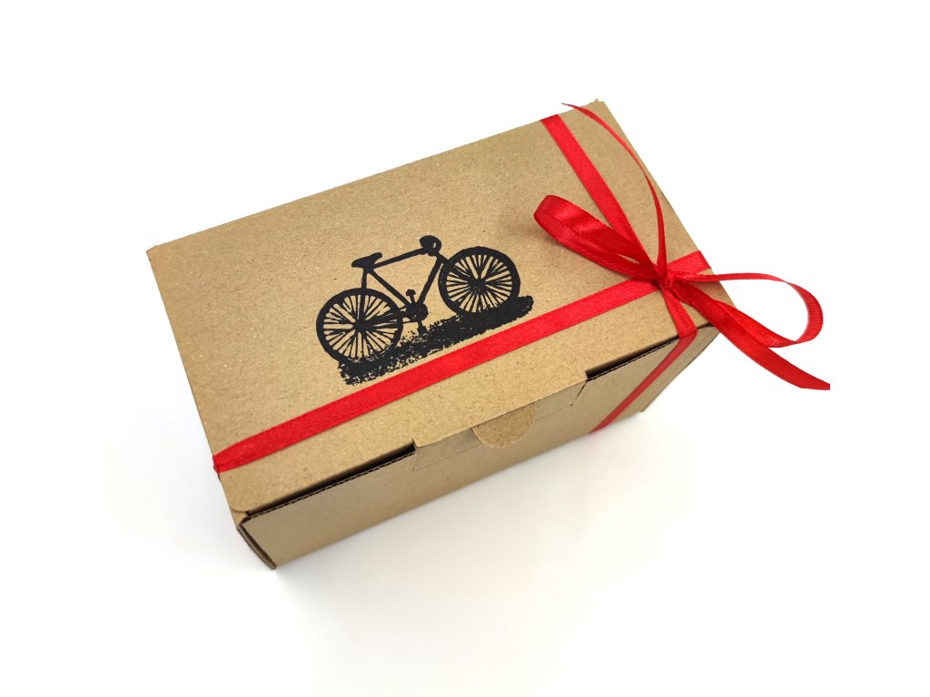 Dárky jsou zabalené v kraftové krabičce s designem jízdního kola.