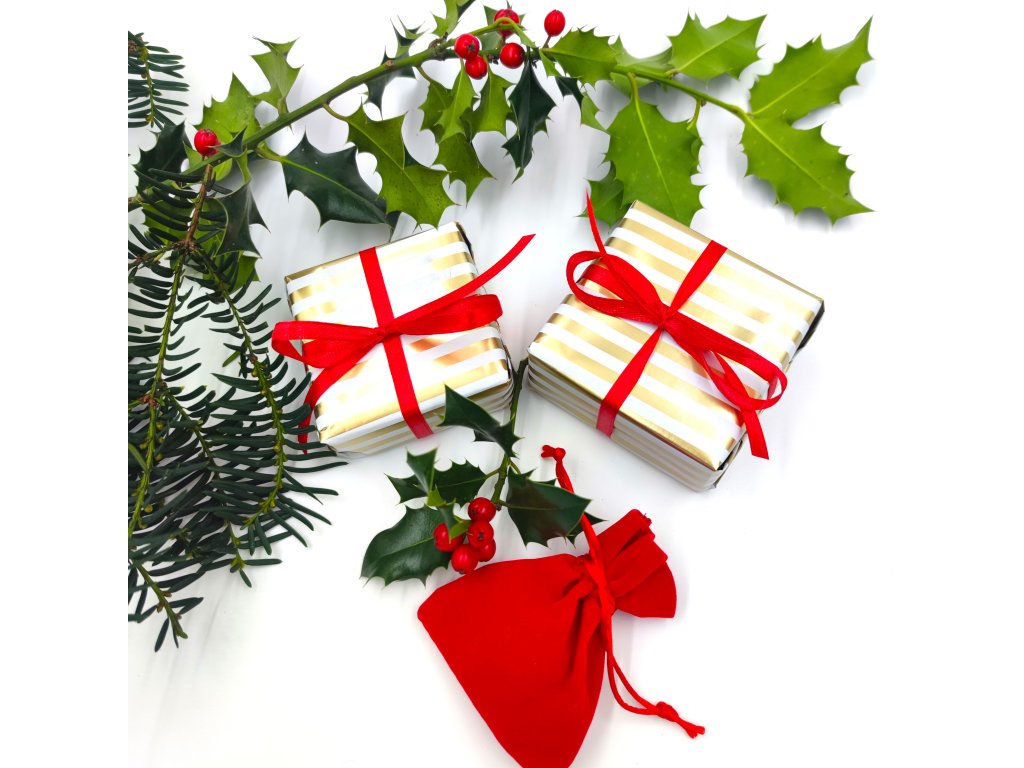 Každý dárek je zabalený v dárkovém papíru a převázaný stuhou.