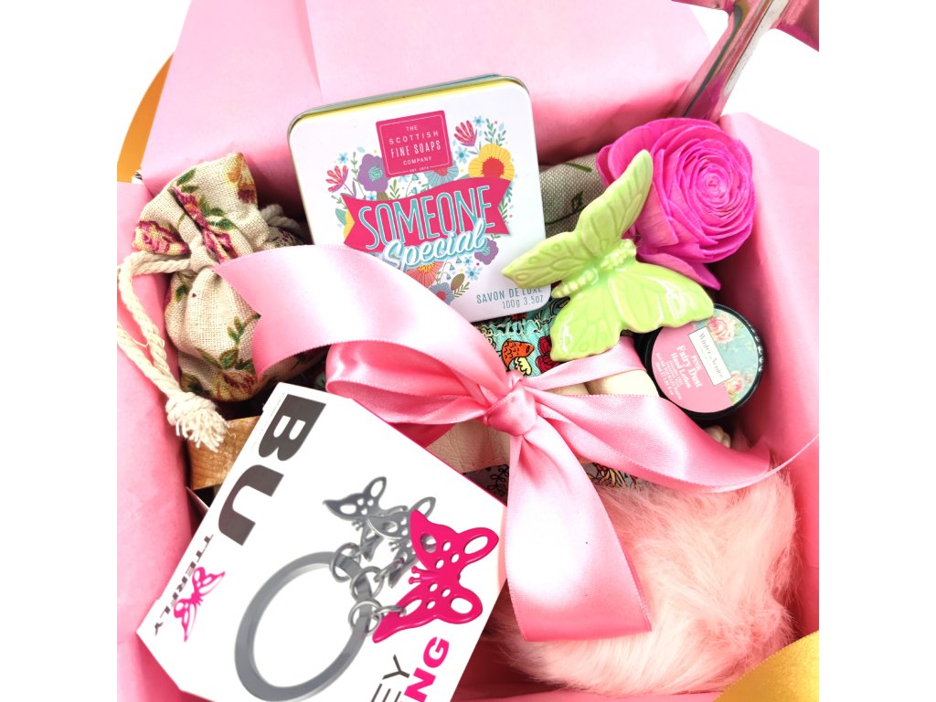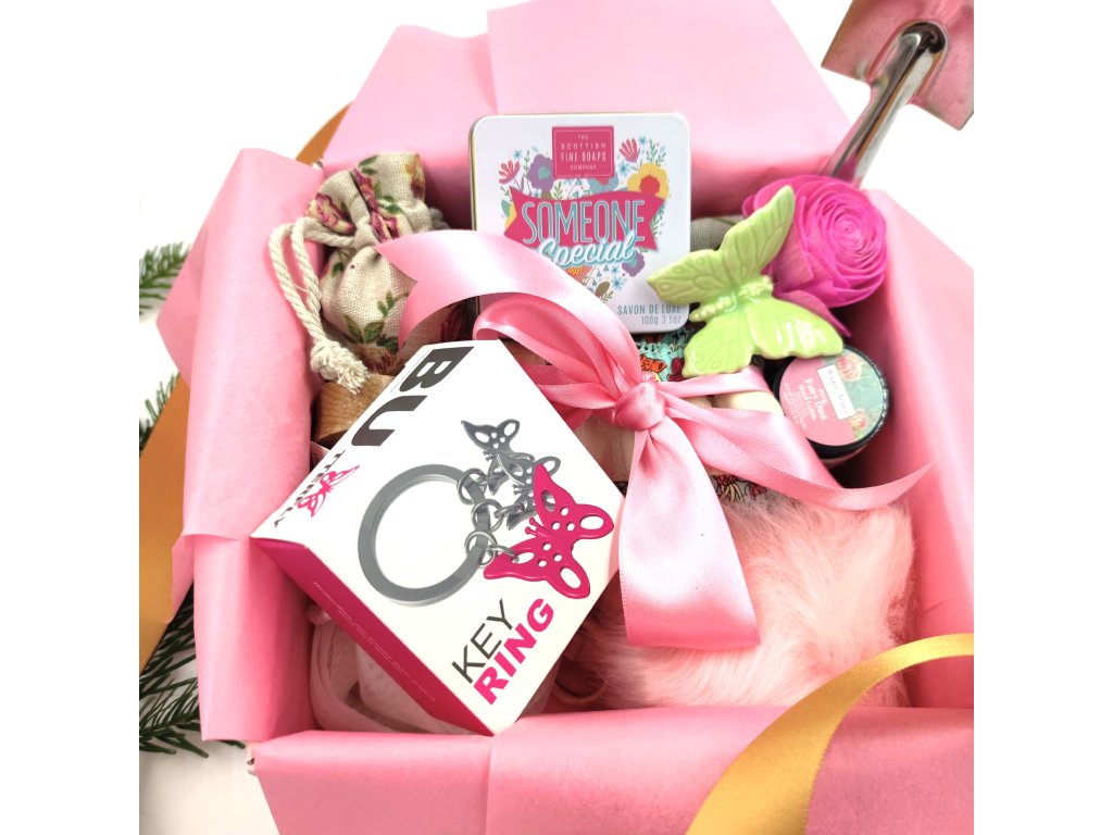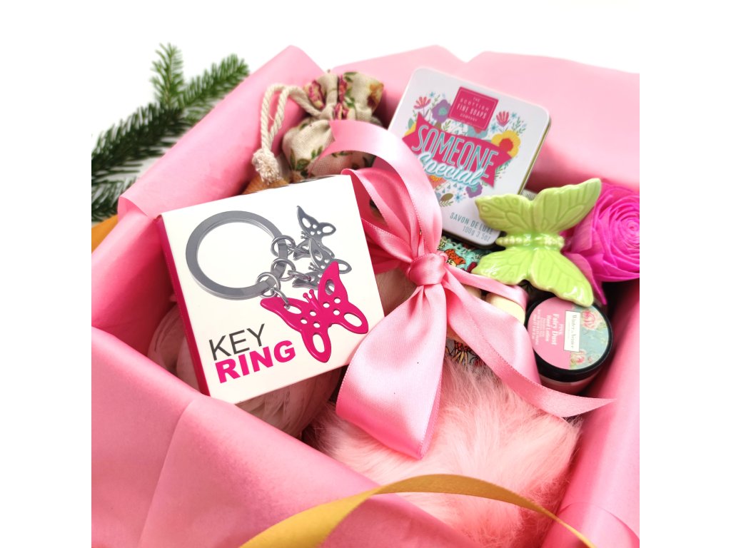 Vše jsem zabalila do hedvábného papíru, převázala atlasovou stuhou a uložila do světle růžové dárkové krabičky.