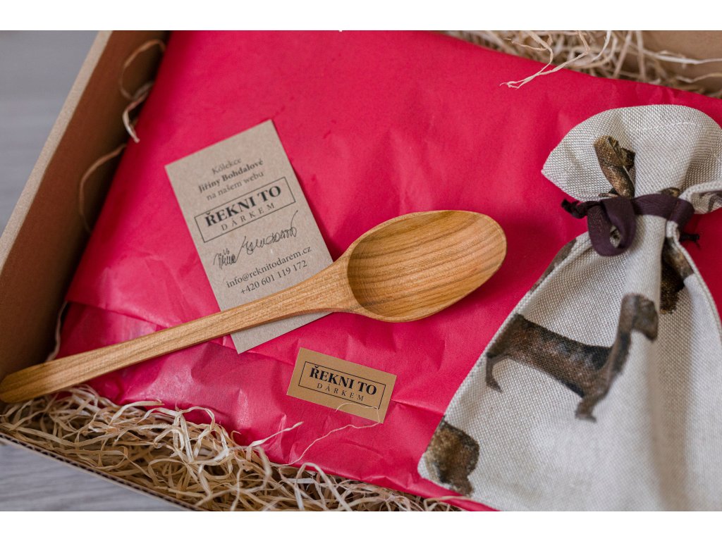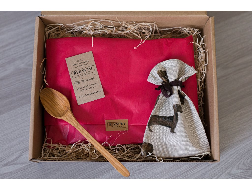 Receptář s recepty od Jiřiny Bohdalové, zástěra s motivem jezevčíků, mini sáček a dřevěná lžíce